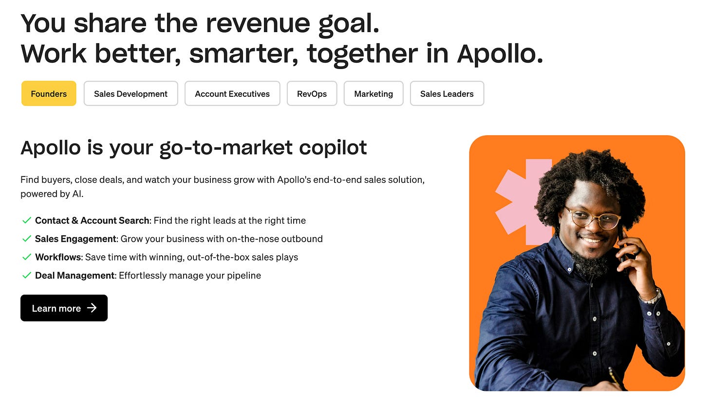 Competitor content: This would target terms like “best tools for outreach” and “Apollo competitors”. To understand what type of content to produce around those, I’d start with researching the search intent of Google users around those terms. This type of content is incredibly useful in the consideration phase when potential customers are problem-aware, but they don’t quite understand the landscape of all the ways in which their problem(s) can be solved.