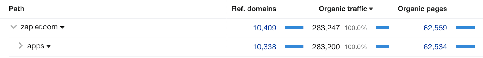 According to Ahrefs, Zapier has created close to 63,000 of these templated pages (all follow a similar URL architecture that includes “/apps/”), resulting in more than 280,000 organic views each month.