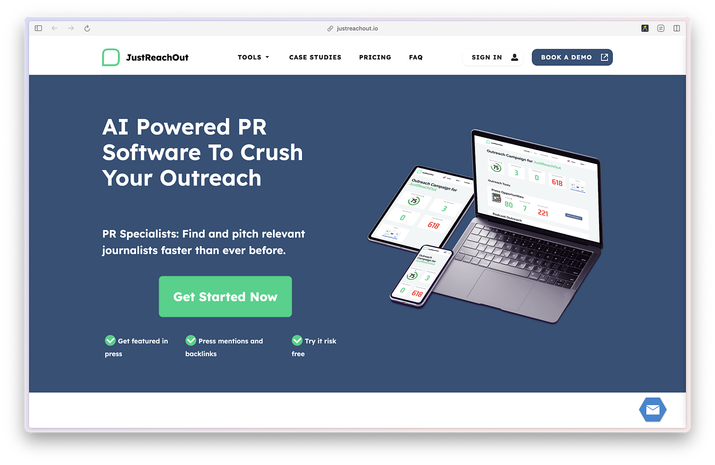 JustReachOut is an email platform that specializes in PR outreach. Everything from the messaging on the homepage to the specific features (e.g. database of 700k+ journalists, etc.) speaks to that segment.