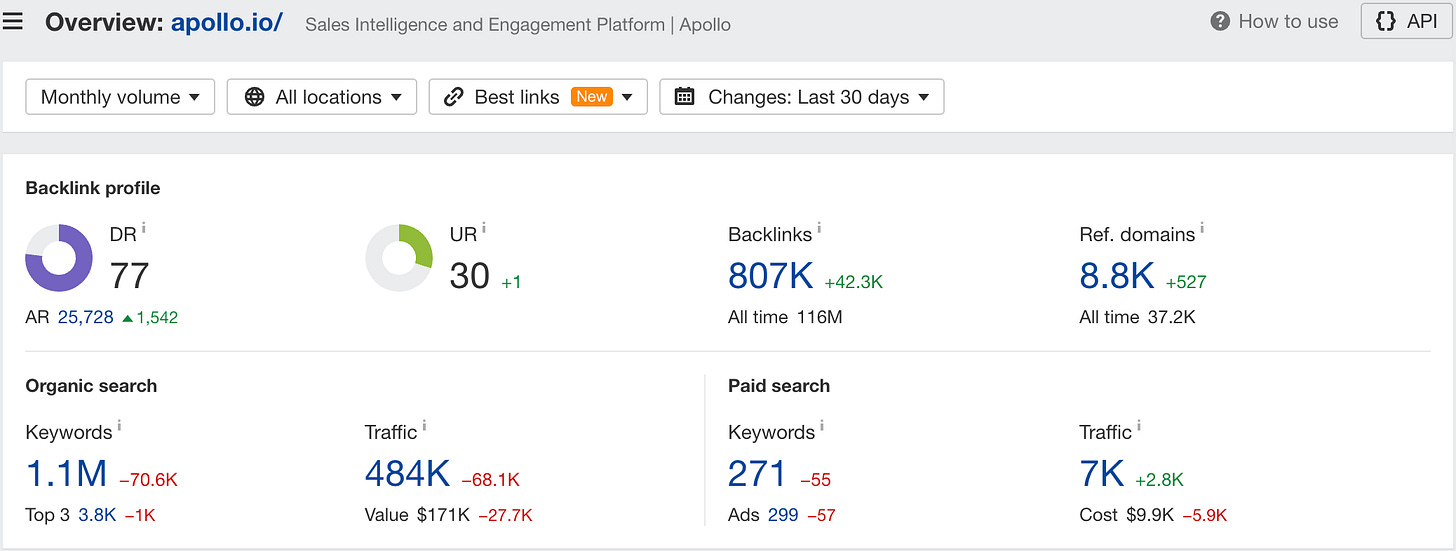 (Notice the difference in numbers between organic and paid search. Also, Apollo ranking for over 1 million organic keywords is mind boggling.)